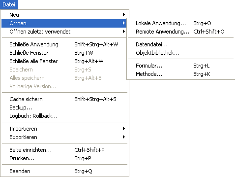 Über das Menü Datei/Ablage>Öffnen bzw. die entsprechende Schaltfläche in der 4D Toolbar können Sie die Art zum Öffnen der 4D Anwendung auswählen: