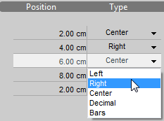 Puede cambiar manualmente las tabulaciones individuales en la lista mediante la introducción de un nuevo valor Posición directamente en la celda y/o seleccionando un nuevo Tipo en el menú desplegable: