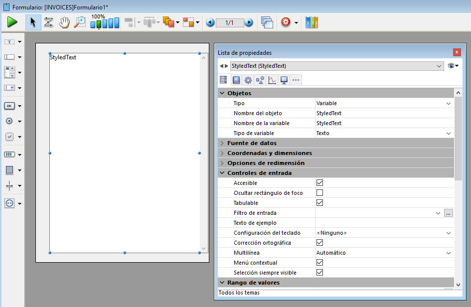 Añade un área de texto con estilo (variable) donde puede definir el tipo de fuente, su tamaño y color. Esta área se puede redimensionar y tiene una barra de desplazamiento vertical y un menú contextual. Puede modificar estas funcionalidades por defecto utilizando la lista de propiedades.