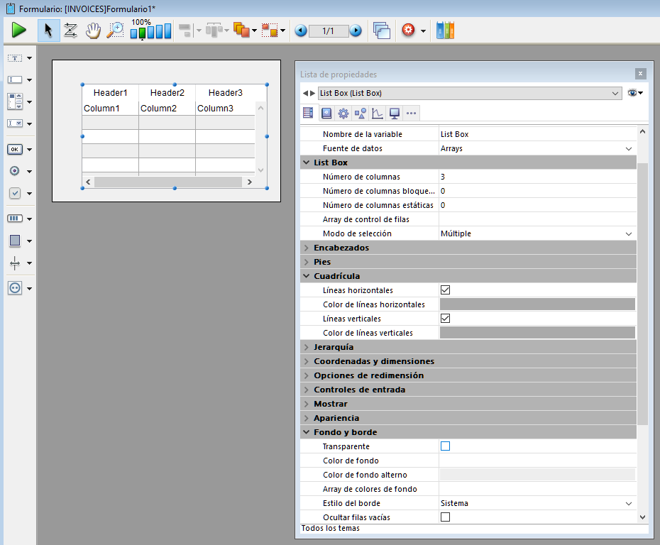 Agrega un objeto list box de tres columnas que puede utilizar para visualizar arrays de datos. Se utiliza la lista de propiedades para especificar la fuente de datos y definir las opciones deseadas.