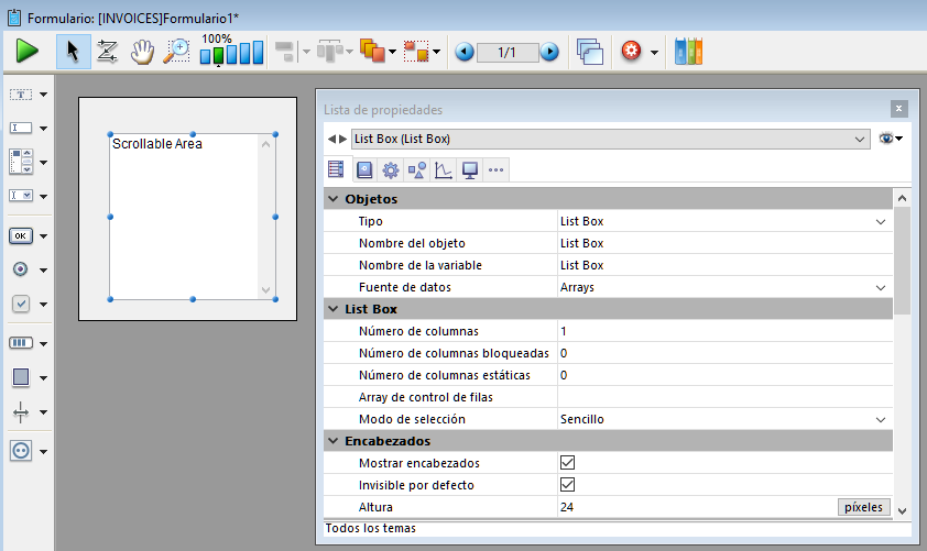 Añade un área de desplazamiento que consiste en un list box de una sola columna cuyos encabezados y pies no se muestran. Esta área no es editable por defecto, pero puede configurarla utilizando la lista de propiedades.