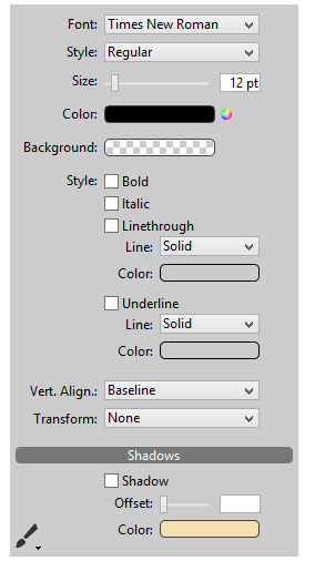 Este panel gestiona los estilos de fuente estándar y las propiedades de texto del área 4D Write Pro.