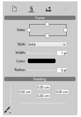 Los marcos se pueden definir para la totalidad del documento o para párrafos individuales, o para las imágenes que se encuentran en el texto. Utilice los iconos de la parte superior del panel para configurar estos ajustes por separado para el área deseada: es decir