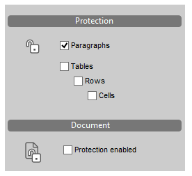 Para evitar la modificación de las partes protegidas, seleccione la opción Protección activada en la sección Documento.