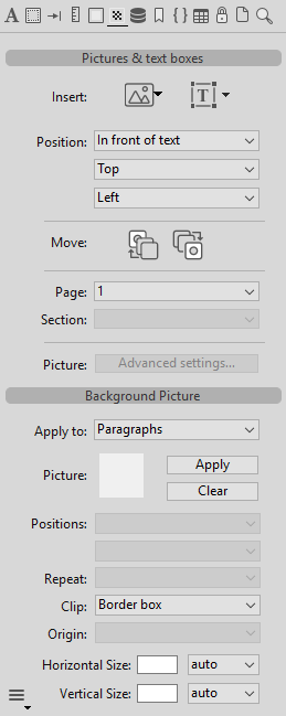 Este panel gestiona las imágenes, cajas de texto e imágenes de fondo para el área 4D Write Pro.