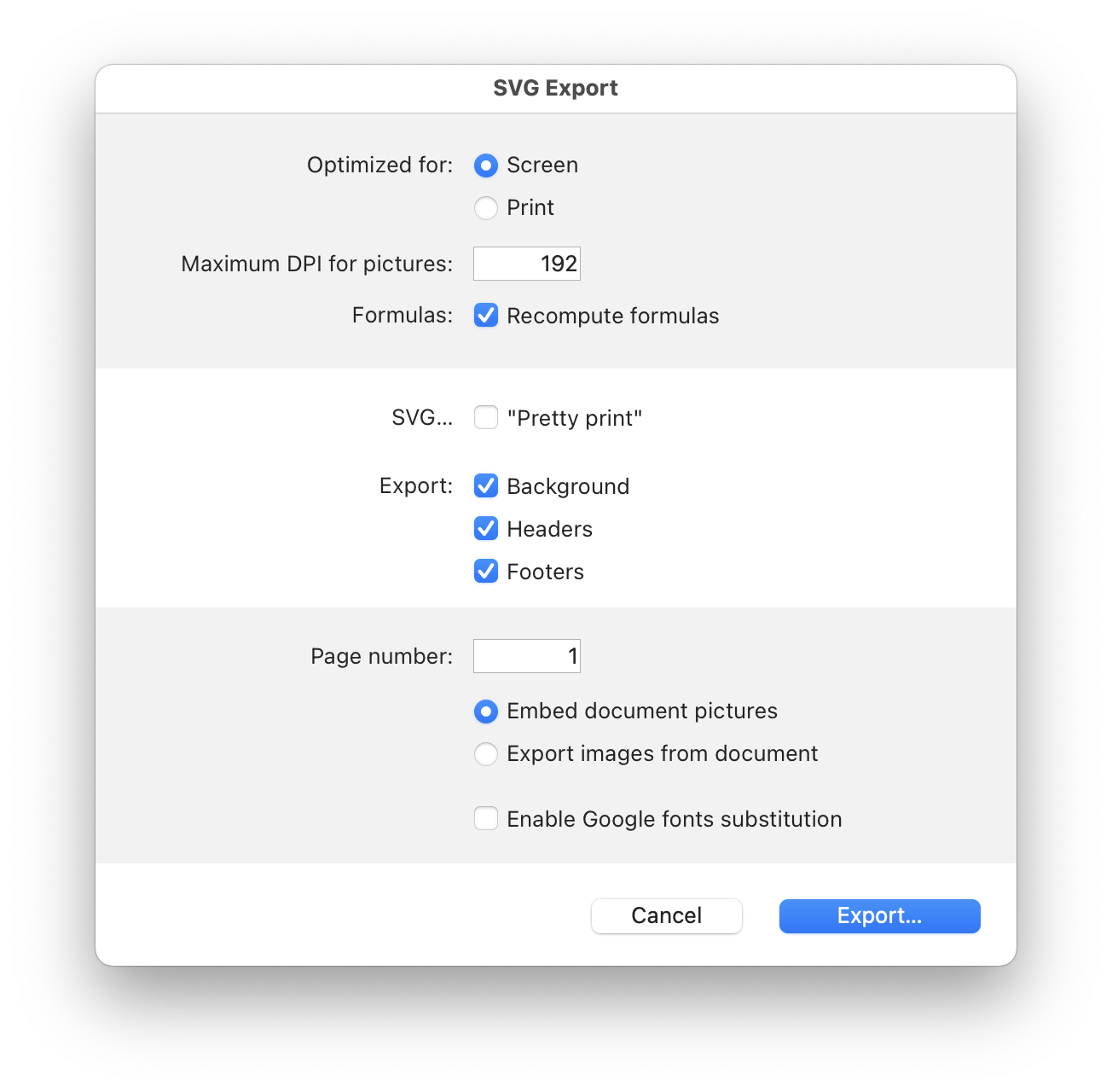 Los comandos de exportación PDF, HTML, HTML Mime y SVG muestran un cuadro de diálogo Opciones de exportación, que permite seleccionar opciones de exportación. Por ejemplo, aquí está el cuadro de diálogo de opciones para la exportación SVG:
