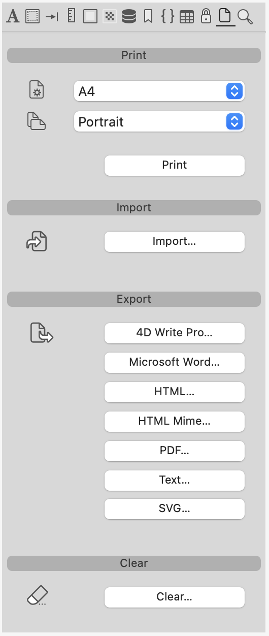 Este panel permite imprimir, importar y exportar documentos.