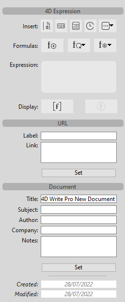 Este panel inserta y administra las expresiones 4D y las URLs en el área 4D Write Pro e incluye un área para la introducción de información útil sobre el documento.