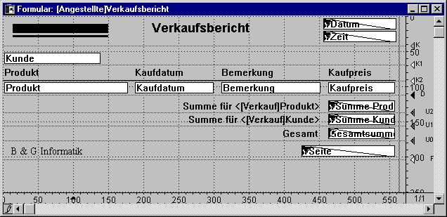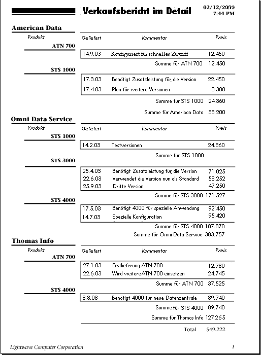vGesamtsumme:=Subtotal(Verkauf)Beachten Sie, dass alle drei Objekte die gleiche Berechnung durchführen und trotzdem zu unterschiedlichen Ergebnissen führen. Da sie in unterschiedlichen Umbruchbereichen angeordnet sind, werden sie zu unterschiedlichen Zeiten durchgeführt und führen ihre Berechnungen für unterschiedliche Gruppen von Datensätzen durch. Weitere Informationen dazu finden Sie im Abschnitt “Berichte mit Umbrüchen” unter Formulare für gedruckte Berichte.