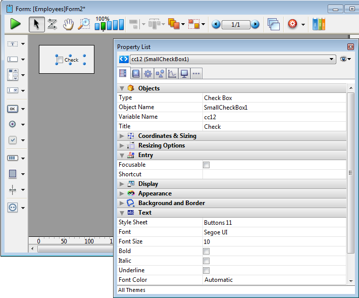 Ajoute une case à cocher basqiue. Vous pouvez utiliser la Liste des Propriétés pour modifier ses propriétés.
