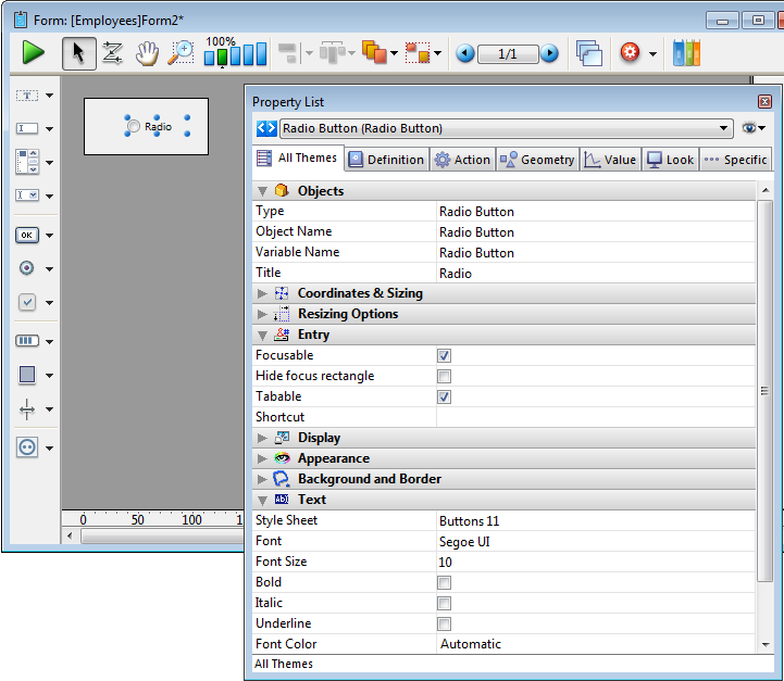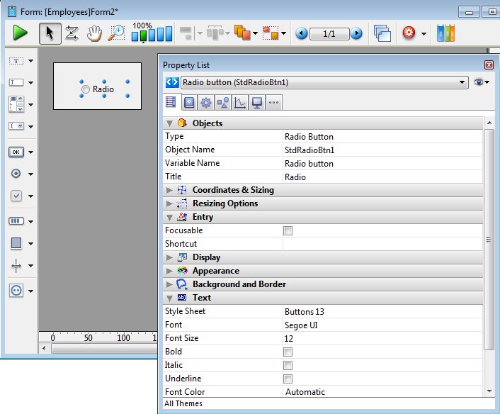 Ajoute un bouton radio basique. Vous pouvez utiliser la Liste des Propriétés pour modifier ses propriétés..