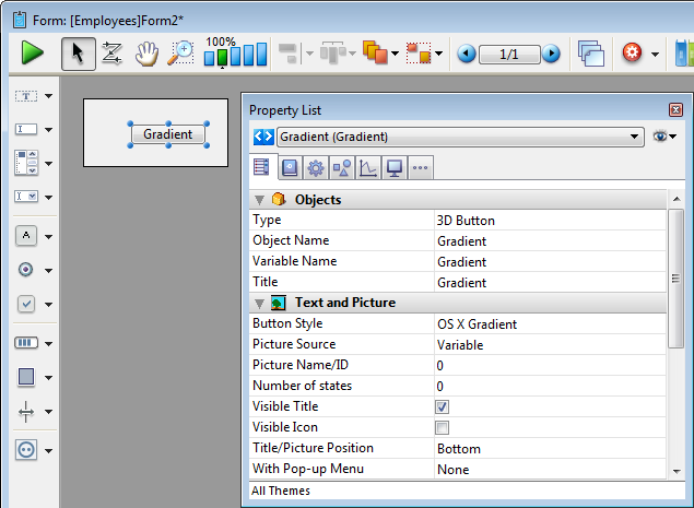 Ajoute un bouton 3D gradient dont l'apparence a été préformatée. Vous pouvez utiliser la Liste des Propriétés pour modifier ses propriétés.