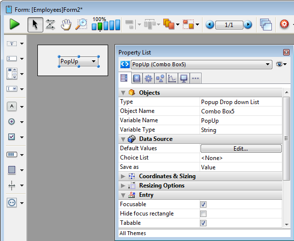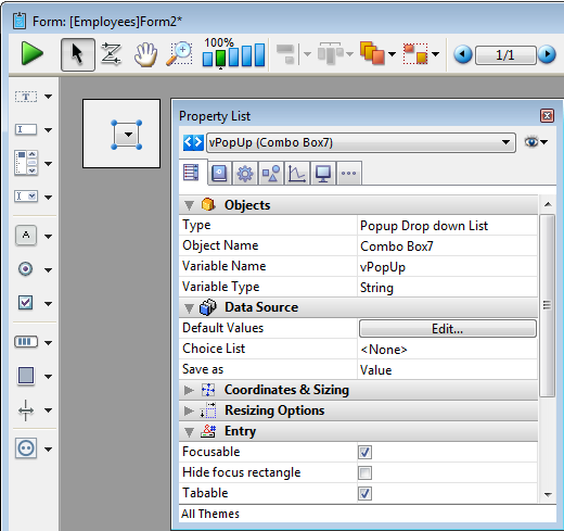 Ajoute un pop-up menu dont la taille est réduite à la forme d'un bouton (disponible seulement sur la plateforme Macintosh). Vous pouvez utiliser la Liste des Propriétés pour modifier ses propriétés.