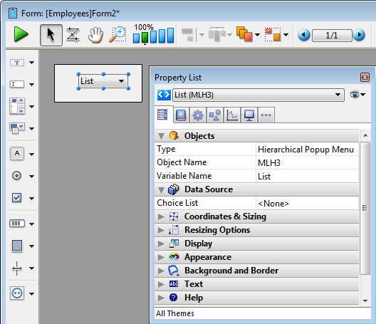 Ajoute un pop-up menu hiérarchique associé à une variable Chaine de type Liste hiérarchique. Vous pouvez utiliser la Liste des Propriétés pour modifier ses propriétés.