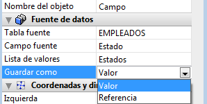 Cuando asocia una lista y una lista de valores obligatorios a un campo o a una variable, puede utilizar la opción Guardar como Valor/Referencia en el tema de "Fuentes de datos" de la Lista de propiedades.