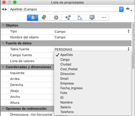 Cuando transforma una variable en un campo, 4D asigna por defecto al objeto el primer campo de la primera tabla. Puede definir manualmente la Tabla y el Campo fuente (tema “Fuente de datos”).