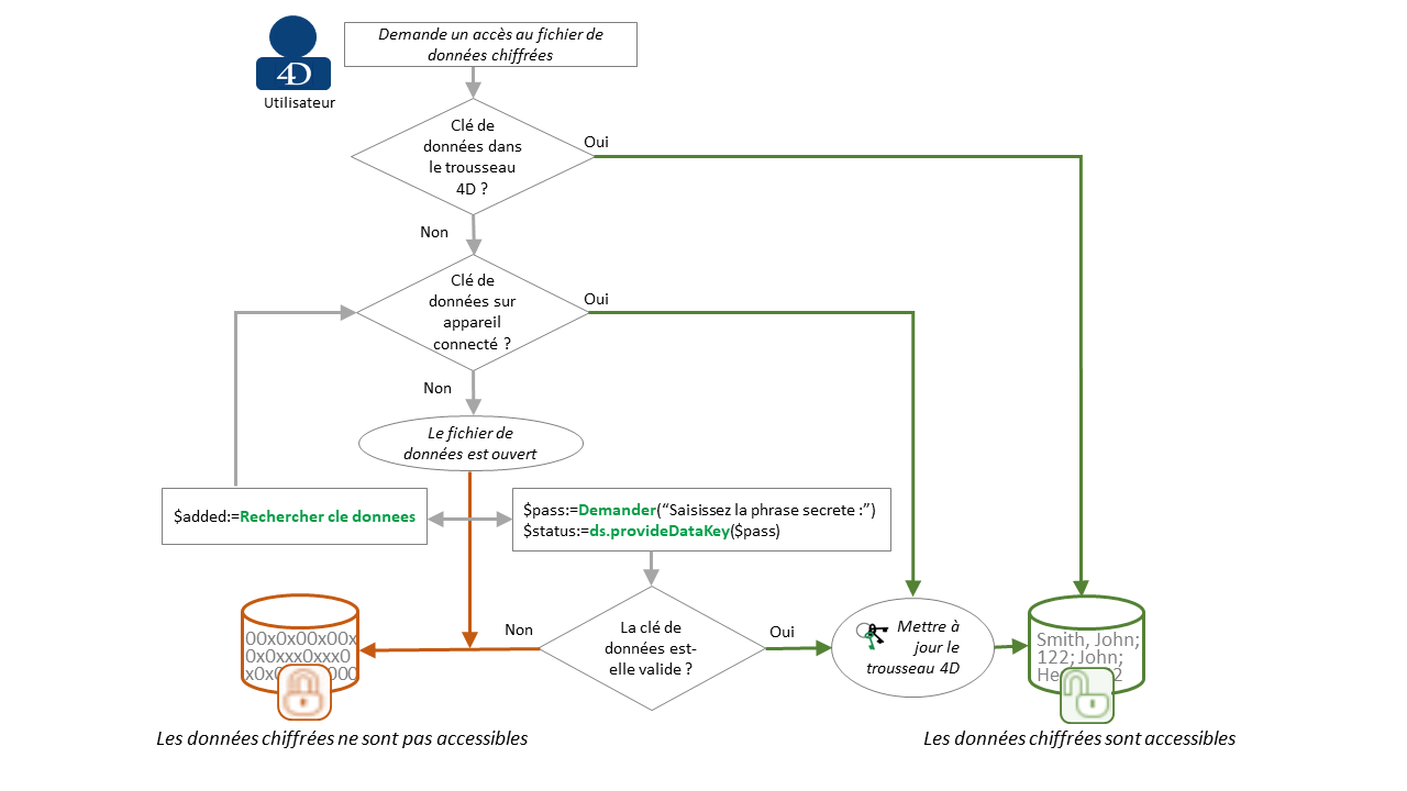 Lorsque l'utilisateur essaie d'ouvrir un fichier de donnés chiffrées, 4D recherche une clé de chiffrement valide dans le trousseau 4D. Si elle est trouvée, l'accès (lecture/écriture) aux données chiffrées est accordé.