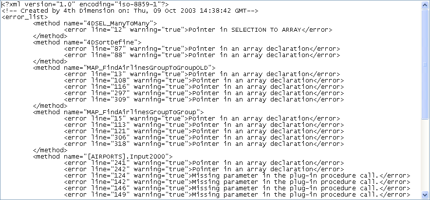 • At the top of the file is the list of errors and warnings, sorted by method and in the order of their creation in 4D;
