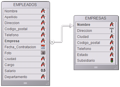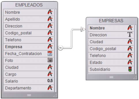 La siguiente imagen muestra una relación creada entre la tabla [EMPLEADOS] y la tabla [EMPRESAS] en el editor de estructura: