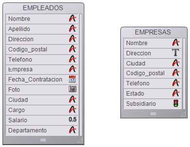 La tabla [EMPLEADOS] contiene un registro por persona. La tabla [EMPRESAS] contiene un registro por empresa. La relación entre estas dos tablas le permite visualizar, introducir, modificar o eliminar información de las dos tablas. Por ejemplo: