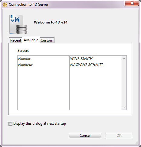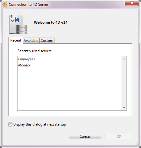 Si selecciona la opción Mostrar este diálogo en el próximo inicio, esta caja de diálogo se mostrará automáticamente al inicio de la aplicación 4D.