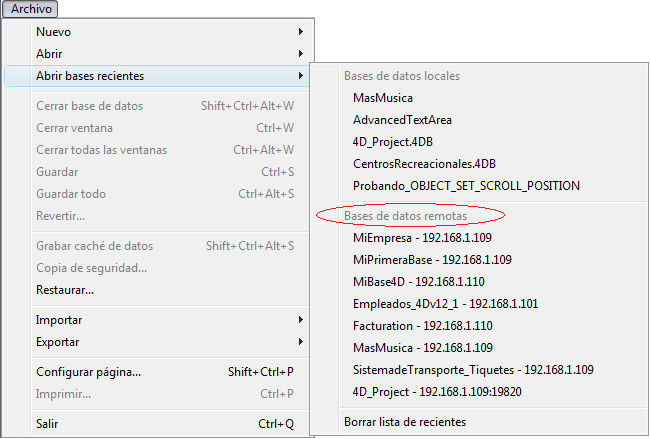 Este comando se encuentra en el menú Archivo de 4D. Si utiliza la aplicación 4D para abrir las bases locales y para conectarse a las bases remotas, este menú lista los dos tipos de bases. Las bases remotas se ubican en la parte inferior del menú: