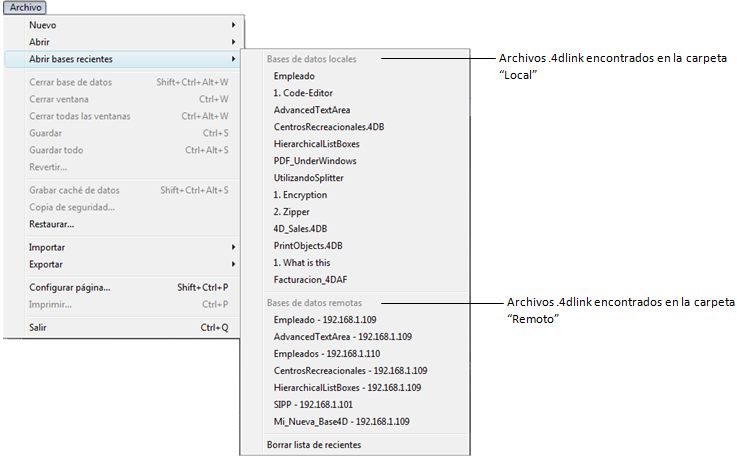 Los archivos que se encuentran en estos directorios son mostrados por 4D en el submenú Abrir bases recientes del menú Archivo: