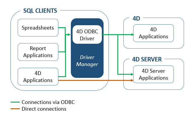 4D SQL サーバへの外部アクセスはODBC (すべての設定) 経由、または直接 (4D Server に接続されている4D クライアントアプリケーション) 行われます。以下の図はこのことを示しています: