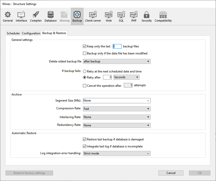 Restore last backup if database is damaged: When this option is checked, the program automatically starts the restore of the data file of the last valid backup of the database, if an anomaly is detected (corrupted file, for example) during database launch. No intervention is required on the part of the user; however, the operation is logged in the backup journal. Note: In the case of an automatic restore, only the data file is restored. If you wish to get the attached files or the structure file, you must perform a manual restore.