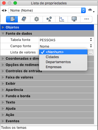 • O conteúdo da Lista de propriedades é contextual. Quando o atributo Editável não está selecionado na Lista de propriedades, as propriedades relacionadas com o controle de entrada de dados (Obligatório, Tabulável, Filtro de entrada, etc.) desaparecem da lista.