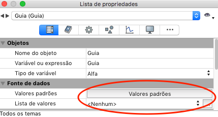 Para os objetos que aceitam uma lista de valores padrão, a área dos valores padrão é convertida em um botão: