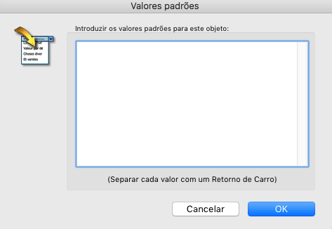 Escreva a lista de valores padrão. Cada valor deve aparecer em uma linha diferente. Clique no botão Aceitar para fechar a caixa de diálogo e retornar à janela Lista de propriedades.