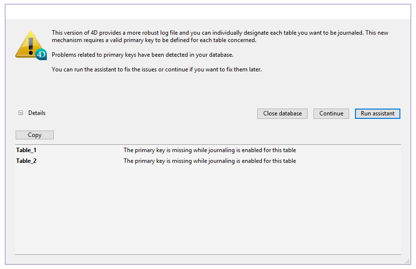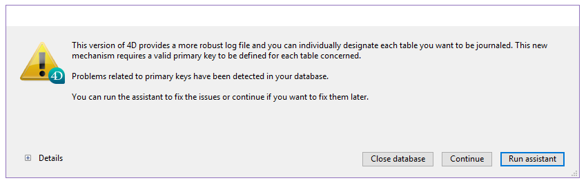 Al abrir en v17 una base anterior a la v14, aparece una caja de diálogo de error cuando al menos una tabla en la base no tiene una llave primaria válida: