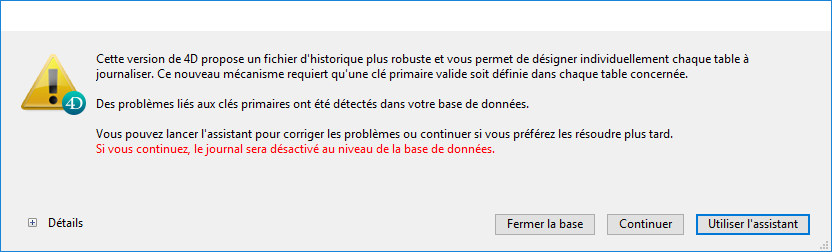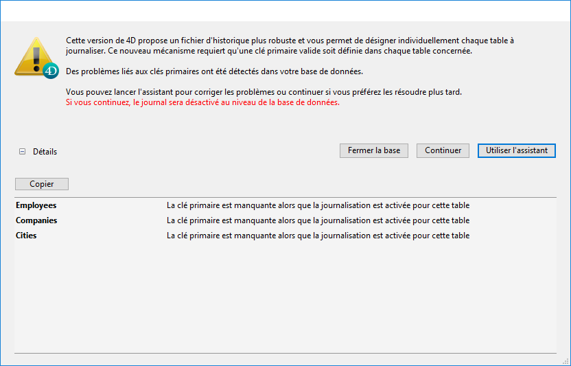 Note : Si la journalisation n’est pas activée dans la base, la boîte de dialogue d’erreur vous laisse la possibilité d’ouvrir la base malgré l’erreur de clé primaire.