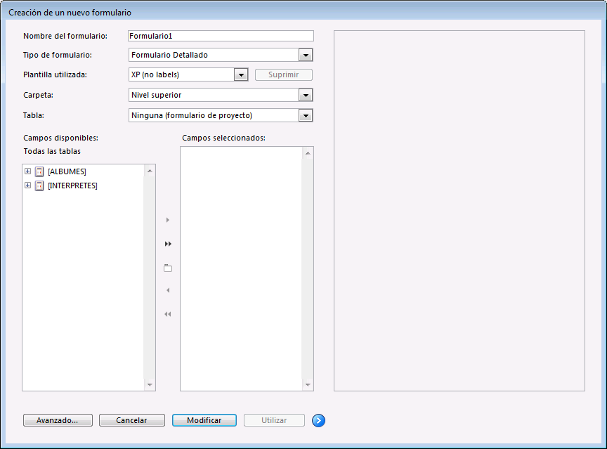 Para crear un formulario de tabla, elija el nombre de la tabla del formulario en el menú “Tabla”. Sus campos se listan en orden alfabético en el área lista de campos si la opción Tabla actual está seleccionada en la lista desplegable de las tablas. O Para crear un formulario de proyecto, elija Ninguno (Formulario de proyecto) en el menú “Tabla”. La lista de campos de todas las tablas entonces estará disponible en el área Lista de campos. Los tipos Formulario listado y Formulario listado impresión se suprime de la lista de tipos disponibles.