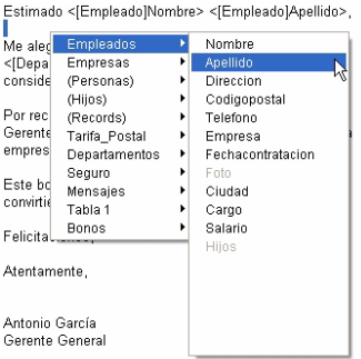 En el área de texto, escriba el texto que quiere en su carta, colocando los nombres de las variables y de los campos entre los signos menor que (<) y mayor que (>).