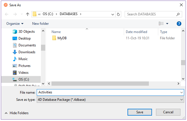 Elija Nuevo> Proyecto de base de datos... en el menú Archivo o desde el menú asociado al botón Nuevo en la barra de herramientas 4D. A standard Save as dialog box appears.