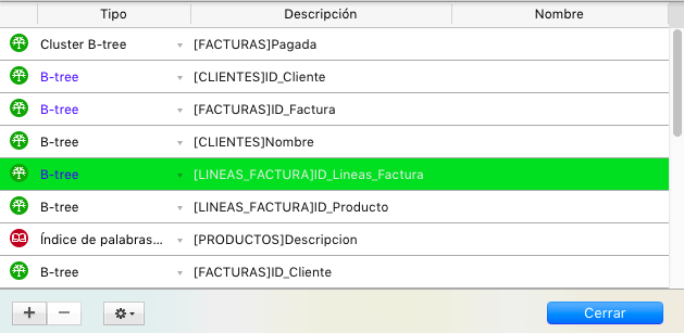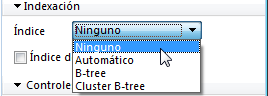 Tipo: tipo de índice. Cada tipo de índice (Árbol-B, Árbol-B agrupado, palabras claves) se representa con un icono diferente. Es posible modificar el tipo de índice haciendo clic en el triángulo inverso y seleccionando un valor diferente en el menú pop-up.