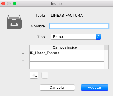 Para borrar un campo del índice, selecciónelo y haga clic en el botón . Una vez configurado el índice, haga clic en Aceptar para generar el índice.