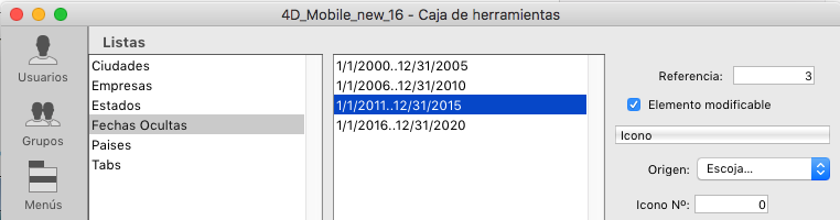 4D le permite introducir rangos de números, fechas y horas en una lista. Puede utilizar estos rangos como rangos de validación de la entrada de datos haciendo la lista obligatoria o excluida en un formulario.