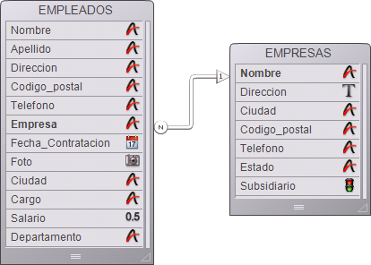 4D muestra la relación como una flecha entre dos tablas en el editor de estructura. La forma del conector de origen y final como también los caracteres N y 1 indican la dirección de la relación: