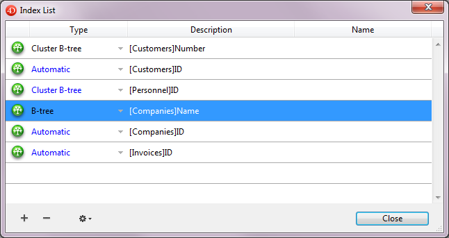 Type: Index type. Each type of index (B-tree, Cluster B-Tree, keyword) is depicted with a different icon. It is possible to modify the index type from the Index explorer by clicking on the inverted triangle and selecting a value in the pop-up menu.