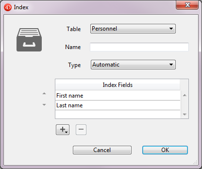 Name: Index name entry area. This name is used by the 4D language commands.