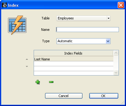 - 名称: インデックス名入力エリア。この名前は4Dランゲージコマンドで使用されます。