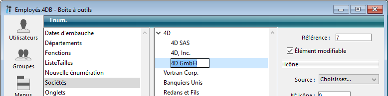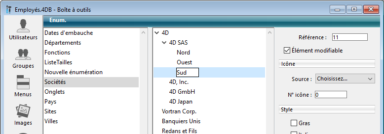 Les énumérations sont crées à l’aide de l’éditeur d’énumérations, situé dans la boîte à outils. Vous pouvez modifier toute énumération à tout instant en retournant dans l’éditeur d’énumérations et en réalisant les modifications.