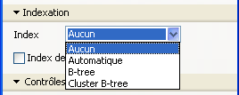 Type : Type d’index. Chaque type d’index (B-tree, Cluster B-Tree, mots-clés, index composite) est représenté avec une icône différente. Il est possible de modifier le type d’index en cliquant sur le triangle inversé et en sélectionnant une valeur différente dans le pop up menu.