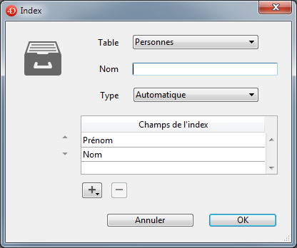 Choisissez l’option Nouvel index... dans le menu contextuel de la table ou Index dans le menu d’ajout d’objets de la barre d’outils de l’éditeur. OU Sélectionnez plusieurs champs en maintenant le bouton Ctrl (Windows) ou Commande (OS X) enfoncé puis cliquez avec le bouton droit de la souris sur un champ et choisissez Nouvel index composite... dans le menu contextuel. La boîte de dialogue de configuration d’index apparaît alors :