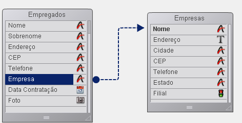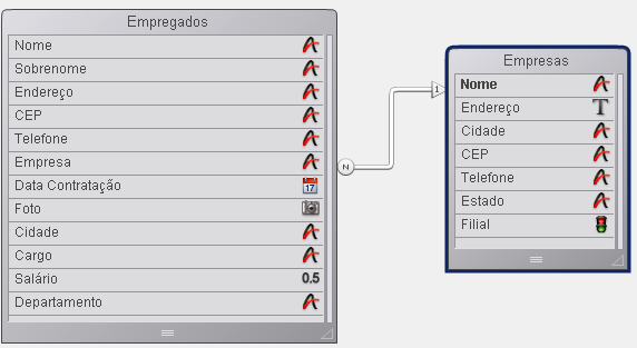 4D mostra a relação como uma flecha entre duas tabelas no editor de estrutura. A forma do conector de origem e fim, assim como os caracteres N e 1, indica a direção da relação:
