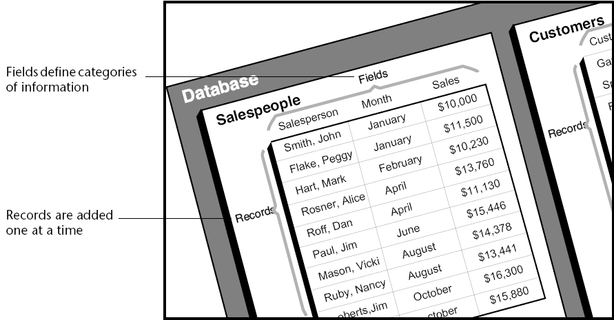A field name usually identifies the information that goes into the field. A field name is usually something like Name, Address, or Phone Number. Each field has a field type that identifies the kind of information that can be entered in a field: numbers, dates, alphanumeric characters, and others. Because each field contains a specific type of data, you can perform calculations and other operations on the information in the fields. For example, numbers from two fields can be added. A date in one field can be compared to a date in another field. A person’s first name (stored in one field) can be displayed in front of the last name (stored in another field) to make the first line of an address label.