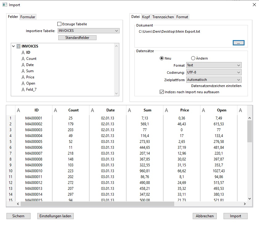 Nach Beenden des Importvorgangs wird das Dialogfenster geschlossen. Die Tabelle, in welche die Daten importiert wurden, wird die aktuelle Tabelle.
